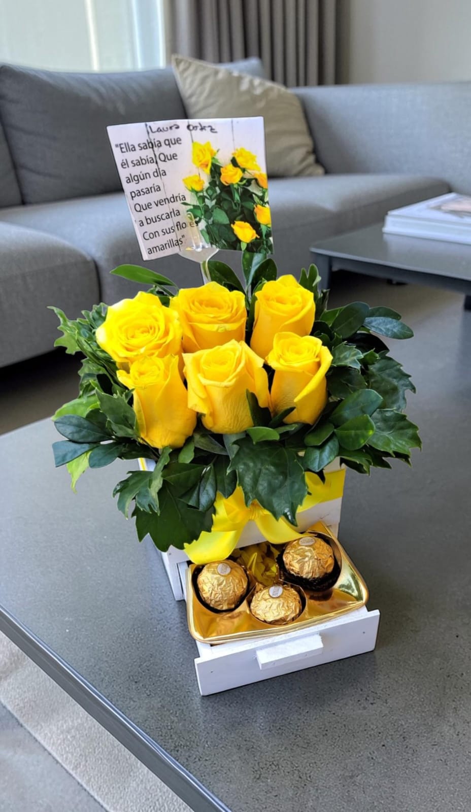 Regala este precioso joyero con 6 rosas amarillas 3 chocolates ferrero.