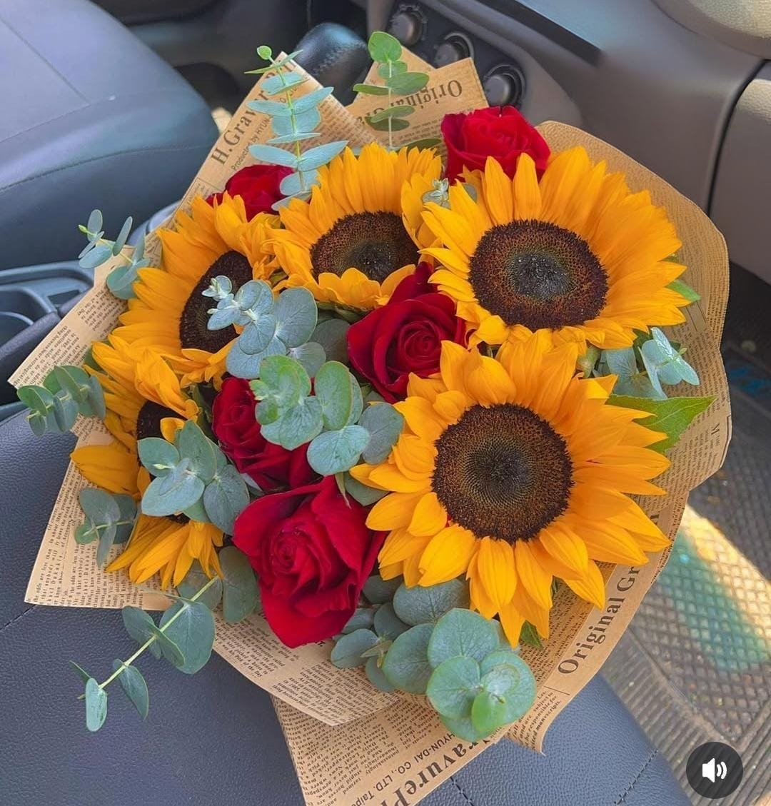 Rojo y amarillo es la combinación perfecta para regalar. Envía este ramo de girasoles y rosas